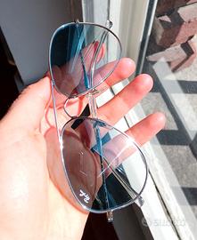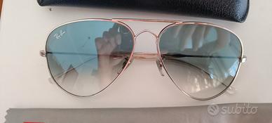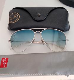 Vendo Ray-Ban da sole – modello Aviator Gradient (unisex). Montatura color argento e lenti blu sfumate (gradient). La montatura è stata utilizzata per poco tempo con lenti da vista, mentre le lenti da sole sono nuove e mai utilizzate. Occhiali in ottime condizioni generali.