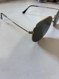 Vendo occhiali da sole Ray-Ban Hexagonal Flat Lenses, modello iconico con montatura in metallo dorato e lenti esagonali verdi. Lo stile vintage si unisce a un design moderno, perfetto per chi cerca un look distintivo ed elegante.