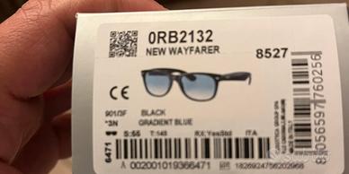 Vendo occhiali da sole Ray-Ban New Wayfarer modello ORB2132, originali, nuovi e mai usati. Colore montatura: Black Lenti: Gradient Blue – effetto sfumato azzurro molto elegante Misure: 55-18 (calibro 55 mm, ponte 18 mm, aste 145 mm) Made in Italy 🇮🇹