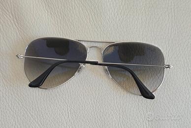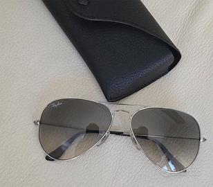 Vendo occhiali da sole ray-ban, come usciti da negozio, perché assolutamente mai utilizzati perché ne ho altro modello. Montatura argento; lenti sfumate. Li vendo soltanto 85 euro. Io sono uomo ma vanno bene anche per donna. A disposizione per eventuali info o altre foto