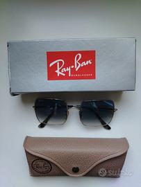 Occhiali da sole Ray-ban con montatura squadrata in metallo lucido argento e lenti azzurro sfumato. Ottimo stato, piccolo segno a lato della lente sinistra. Con custodia