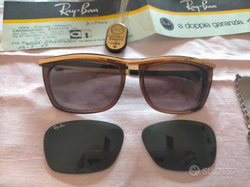 Vendo l'intero set originale: montatura vintage in buone condizioni con piccoli segni del tempo (ci sono delle lenti da vista montate) + lenti originali RayBan a parte, nuove mai usate + tutte le certificazioni del 1987. Un'opportunità rara per un pezzo così completo e autentico.