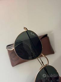 occhiali da sole Ray-Ban originali, modello classico Round Metal (spesso conosciuto anche come "Vale"), con montatura sottile in metallo dorato e lenti tonde nere/verde scuro dal carattere vintage ed elegante.