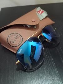 Vendo occhiali da sole Ray-Ban originali modello RB3002, montatura in metallo dorato con lenti blu sfumate.