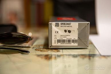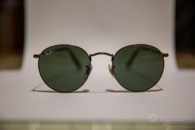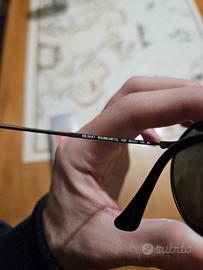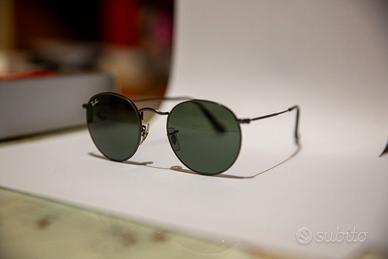 Vendo per inutilizzo occhiali da sole Ray-Ban originali modello RB3447 (Round Metal). Lenti verdi G-15, ponte singolo (una sola barretta sopra il naso). Occhiali usati ma ben tenuti. Segnalo un lieve graffio sulla lente destra, visibile da vicino ma che non influisce sulla visione. Completi di custodia originale e panno per la pulizia. Modello iconico e sempre attuale.