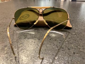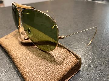 Vendo Splendidi occhiali da sole RAY BAN shooter 1950 10K 64 SUNGLASSES gold b&l changeables USA, produzione americana Bausch & Lomb, originali anni 50, montatura dorata 10k, completi di custodia originale, occhiali da sole che vengono venduti anche 1000/1500€ in queste condizioni e originali.
