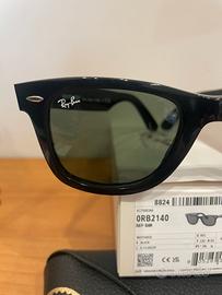 Occhiali da sole Ray Ban modello Wayfarer RB2140 901 colore nero con lente verde. Misura 50–22 completo di accessori custodia e scatola. Prodotto nuovo solo aperto per prova .