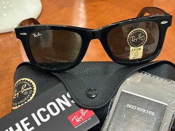 Occhiali da sole Ray Ban modello Wayfarer RB2140 901 , misura 50–22, colore nero lucido, con lente green. Completo di tutto. Articolo nuovo