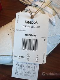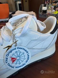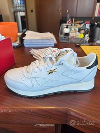 Bellissime Reebok classic leather bianche cin dettagli scuri in pelle. Ricevute in regalo ma del numero sbagliato. NUOVE E MAI INDOSSATE, con ancora csrtellini attaccati e cinfezione originale. Spedisco in tutta italia con corriere tracciato con contributo di €1. Poco trattabile