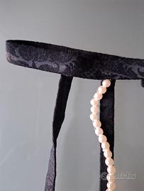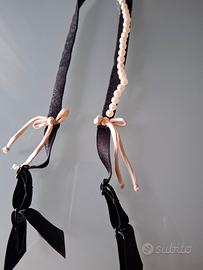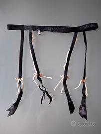 Vendo reggicalze nero tg 2 in seta damascata nera, decorato con due fili di perle sul davanti e 4 nastrini rosa.