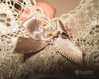 Descrizione: bellissimo reggiseno ben imbottito e con sostegno in plastica sottostante per esaltare il seno. Il suo tessuto è in maglina rasata di cotone in tinta (all'interno delle due coppe); rivestito di tessuto sintetico con lavorazioni molto operate e ricchissimo di pizzo (per tutta l'altra parte rimanente). Un piccolo fiocco con a lato un luminoso strass, si presenta esternamente, in basso, tra le due coppe. Trattasi di un capo intimo femminile davvero elegantissimo, molto molto bello. L'etichetta interna con la composizione del tessuto è stata tagliata perché causava irritazione alla pelle della persona che l'aveva acquistato. L'etichetta del marchio INTIMISSIMI è invece ancora ben visibile (come da penultima foto). Le spalline di questo reggiseno sono di elastico in tinta (ancora di ottima tenuta) e regolabili. Capo ben lavato ed igienizzato, anche con trattamento anti-acaro. Vendiamo per inutilizzo, causa taglia non pienamente corrispondente alla nostra.