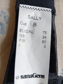 Reggiseno Sanagens nero modello Sally, con motivo in trasparenza. Con ferretto e senza imbottitura. Misura 75 coppa B che corrisponde ad una terza, come da foto dell'etichetta. Nuovo, mai indossato, in confezione originale.