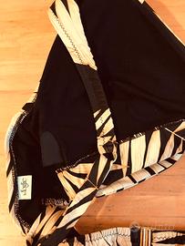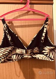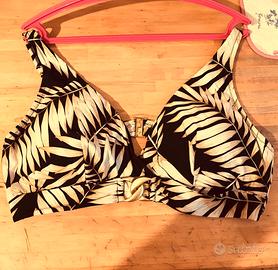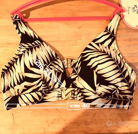 Reggiseno top Bikini del marchio Le Foglie con fantasia a foglie e un dettaglio decorativo centrale. Confortevole ed elastico misura di sottoseno cm 40 e di coppa cm 21 (vedi foto) e offre un comfort perfetto. Il reggiseno ha coppe imbottite che sono rimovibili, scollo a "V" e spalline regolabili.