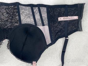 Stupendo corsetto regisseni nero in pizzo con ferretto, firmato Victoria’s Secret. Raffinati dettagli in rosa cipria donano un tocco femminile ed elegante. Perfetto per sentirsi speciale ogni giorno o per un’occasione particolare. Taglia M, coppa DD/E (80) - fit L