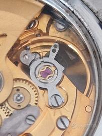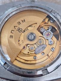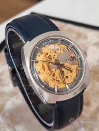 REVUE AUTOMATIC SKELETON – MOVIMENTO DI MANIFATTURA MSR Vendo dalla mia collezione privata questo splendido Revue degli anni '70, un raro esempio di orologio scheletrato di fabbrica con movimento automatico di manifattura (non il solito movimento commerciale). CARATTERISTICHE PRINCIPALI: Movimento: Meccanico a ricarica automatica, calibro MSR interamente scheletrato e dorato. Un vero spettacolo meccanico visibile sia dal quadrante che dal fondello. Cassa: In robusto acciaio inox, forma "Cushion" (a cuscino) tipica dei seventies. Dimensioni: 34mm (escl. corona) x 38mm (altezza). Ottima presenza al polso. Dettagli: Quadrante con anello blu/grigio e indici in acciaio. Vetro plexiglass appena lucidato, trasparenza perfetta. Cinturino: Pelle blu nuovo, coordinato con i toni del quadrante. Fondello: A vite con oblò in vetro per vedere il rotore e i meccanismi interni. CONDIZIONI E FUNZIONAMENTO: L'orologio è esteticamente in ottime condizioni vintage, con cassa non lucidata e spigoli vivi. NOTA TECNICA: L'orologio è marciante e preciso, ma essendo un pezzo d'epoca con lubrificanti originali, durante l'utilizzo prolungato ha presentato alcuni arresti occasionali. Per un utilizzo quotidiano perfetto consiglio una pulizia/revisione ordinaria. Viene venduto con la formula "visto e piaciuto" nello stato in cui si trova, con prezzo già scontato per tenere conto della possibile revisione.