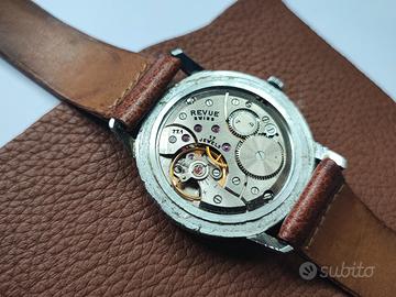 Movimento a carica manuale Revue 77.1 con 17 rubini e 40h di riserva di carica. Movimento revisionato nel 2024.
