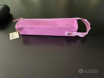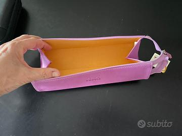 Realizzato in ecopelle italiana con logo Rhodia impresso, fodera in popeline arancione e cuciture decorative reali. La cerniera può essere utilizzata come manico con un pulsante a pressione.