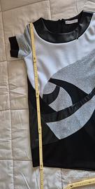 Abito Rinascimento, caratterizzato da un design geometrico moderno e grintoso. Il vestito gioca con diverse texture: inserti in ecopelle nera, pannelli in tessuto glitterato argento che donano luminosità e sezioni in bianco a contrasto. Taglio a tubino che valorizza la silhouette, maniche corte e chiusura con zip invisibile sul retro. Collo a barchetta.