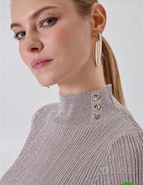 Realizzata in maglia lurex con lavorazione a costine, la sua linea aderente è pensata per esaltare la silhouette con comfort. Il collo alto è impreziosito da un dettaglio ricercato: tre bottoni decorativi sul lato, che aggiungono un punto luce distintivo. Le maniche a metà braccio e la sua struttura easy fit lo rendono tanto scintillante quanto confortevole da indossare.