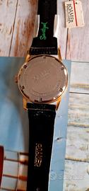 Vendo orologio perfettamente funzionante con movimento a carica manuale, la cassa placcata in oro misura 34mm esclusa corona logata, quadrante bianco perlage, indici e lancette a bastone, fondello a vite, cinturino in pelle originale logato. Orologio degli anni 60 nos. Senza scatola e documenti, non spedisco.