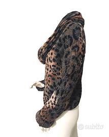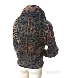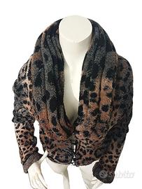 Giacca corta Made in Italy con ologramma di autenticità Class Roberto Cavalli, in misto lana effetto bouclé lurex, stampa animalier leopardato nei toni del cammello, nero e argento glitter. Ampio collo a scialle drappeggiato, chiusura frontale a 5 bottoni, maniche lunghe con possibilità di risvolto.