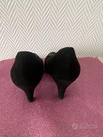 Décolleté eleganti da donna firmate Roberto Spitali, realizzate in morbido camoscio nero. Il modello presenta un raffinato fiocco applicato sulla punta e un tacco a rocchetto di media altezza (circa 7 cm).