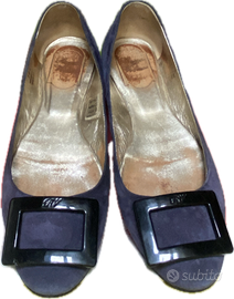 Vendesi Ballerine Roger Vivier Gommettine in camoscio blu navy, taglia 39,5. Condizione: Buona/Ottima, confezione originale con sacchetto per la polvere, usura moderata, una piccola scheggiatura sulla fibbia destra, lievi scoloriture agli angoli delle fibbie, suole in ottime condizioni, solette leggermente scurite.