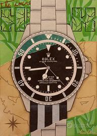 quadro Rolex Submarinenr, 70x50cm. opera originale dal design moderno dipinta a mano su tela. quadro originale realizzato e firmato dall'autore. rappresenta un soggetto iconico reinterpretato in chiave pop moderno, ideale per chi ama l'alta orologeria e vuole dare carattere al proprio ufficio o al proprio studio. opera dai colori intensi e dal forte contrasto. -dimensioni 70x50 -tecnica mista -pezzo unico -pronto da appendere -con certificato di esposizione in una famosa galleria d'arte fiorentina ideale sopra ad una scrivania, sopra ad un divano o in uno studio professionale. prezzo trattabile. per ricerca omega, cartier, tudor, gadget. NB: il contesto attorno alle foto 1 e 3 si tratta di un immagine digitalizzata.