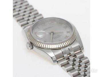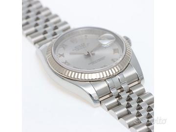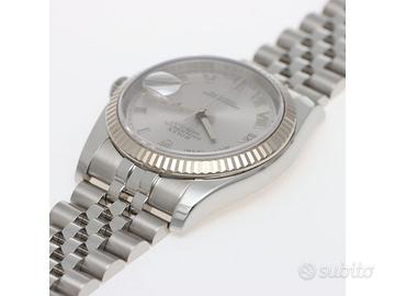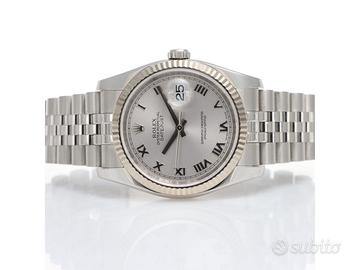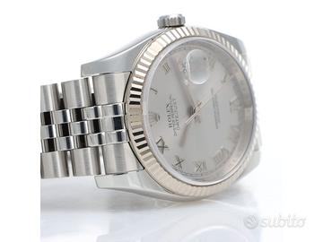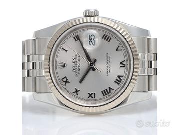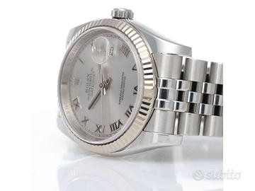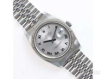 Rolex Datejust Ref. 116234 realizzato in acciaio, Quadrante Argentè con indici in numeri romani, Lunetta fissa zigrinata in oro bianco, Cassa di diametro 36mm, Corona di carica a vite, Datario ad ore 3. Bracciale modello jubilee con chiusura a scomparsa. Orologio in condizioni eccellenti, anno 2011, Full Set, Revisionato 06/2025.