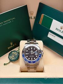 Rolex GMT-Master II referenza 116710BLNR “Batman”. Orologio come nuovo senza segni visibili, compreso di tutte le maglie e di suo corredo originale: garanzia roelx datata 2015, portagaranzia, libretti e box. Disponibile presso nostra gioielleria in centro a Milano o corriere portavalori