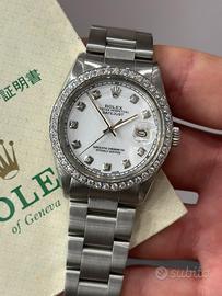 Commerciante di Roma con negozio fisico vende stupendo Rolex Datejust acciaio ref. 16030 anno 1979, cassa da 36 millimetri buone condizioni sia estetiche che funzionali, quadrante aftermarket, doppia ghiera una originale una aftermarket con zirconi, con garanzia originale, no scatola in più si rilascia garanzia del negozio e fattura di acquisto.