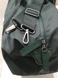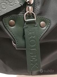 1) Borsone da week-end originale Rolex, in tela e rifiniture in pelle verde bottiglia, con tracolla, logo Rolex a stampa sulla parte frontale, fodera testa di moro e tasca interna, nuovo.