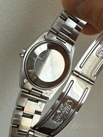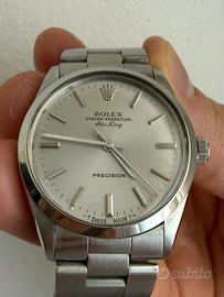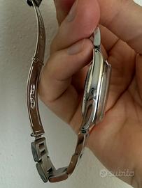 Vendo splendido Rolex Oyster Perpetual Air-King, referenza 5500, un classico intramontabile dell'orologeria svizzera. Questo esemplare presenta il ricercato seriale L645304, che lo colloca a cavallo tra il 1989 e il 1990, rendendolo uno degli ultimi prodotti per questa storica referenza prima della sua uscita di produzione. L'orologio è in condizioni estetiche e meccaniche eccezionali, perfetto per collezionisti o per chi cerca un Rolex vintage elegante e discreto. Caratteristiche Principali: • Referenza: 5500 • Quadrante: Originale "Silver/Argento" con scritte nitide e indici a bastone. Scritta "Precision" a ore 6. • Movimento: Automatico calibro 1520, robusto e affidabile. • Cassa: Acciaio da 34mm (esclusa corona), mai lucidata eccessivamente, mantiene le linee originali e i fori sulle anse ben definiti. • Vetro: Esalite (plexiglass) in ottime condizioni. • Bracciale: Oyster originale ref. 78350 con finali 557, in ottime condizioni di tensione. • Dettagli: Fondello serrato a vite e corona a vite originale con logo Rolex. Condizioni: L'orologio è stato conservato con cura. Presenta minimi segni di utilizzo coerenti con l'età (come da foto), che ne testimoniano l'autenticità e il fascino vintage. Il quadrante è pulitissimo e non presenta fioriture o ossidazioni. Prezzo trattabile. Consegna esclusicamente a mano. Massima serietà. Non accetto scambi con altri marchi (Omega, Tudor, Cartier). Disponibile per verifica presso orologeria di vostra fiducia a carico dell'acquirente. Non esitate a comtattarmi per altre foto o per qualsiasi domanda.