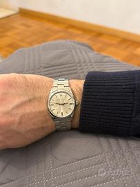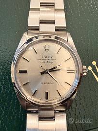 bellissimo e raro, rolex air King Precision referenza 5500 Anno novembre 1987, ultimissima produzione uscita dalla rolex con vetro plastica seriale R Orologio sempre stato di famiglia, utilizzato solamente in poche occasioni particolari Il quadrante originale è perfetto e magnifico così come le lancette non hanno il minimo segno di utilizzo Il calibro che ha lavorato molto poco si può vedere in foto il fondello anch’ esso visibile in foto con la referenza 1002 Messo appunto per la vendita con una revisione completa da noto orologiaio romano che ha rilasciato anche una card con 12 mesi di garanzia fattura del service 700 euro Le guarnizioni sono state cambiate ed anche il vetro E accompagnato dalla scatola con referenza 10 001 Il bracciale Rolex 78350 ha 12 maglie Unica annotazione durante un service rolex le anse 557 sono state sostituite con le più moderne 557B la vendita a mano esclusivamente in mia orologeria di fiducia o in quella del compratore, no altri luoghi Il pagamento esclusivamente con bonifico istantaneo No assegni o d’altro, non proponetelo nemmeno Se a distanza bonifico anticipato e spedizione con DHL express assicurata per l’intero importo trade omega speedmaster tudor submariner cartier