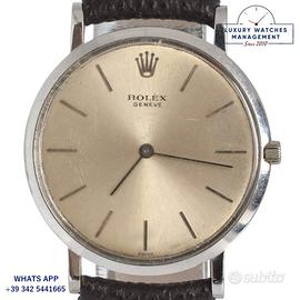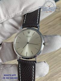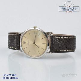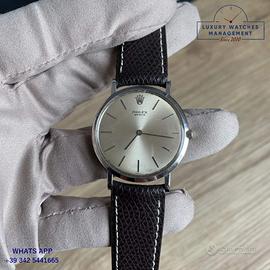Per conoscere i prezzi dei nostri orologi pubblicati su Subito.it visita il nostro sito ufficiale: https://lwmitalia.com/it Rolex Cellini ultra piatto oro bianco 18KT, anno di produzione 1960, ghiera oro bianco 18KT liscia, vetro minerale, quadrante colore argento indici e sfere Baton oro bianco 18KT, movimento meccanico manuale, cinturino pelle di vacchetta colore marrone scuro fibbia dorata oro bianco originale Rolex. Orologio originale Rolex in ogni sua parte, molto raro, revisionato in ottime condizioni, segni di usura assenti o appena visibili, scatola Rolex, garanzia/dichiarazione di vendita nostro negozio valida mesi 12.
