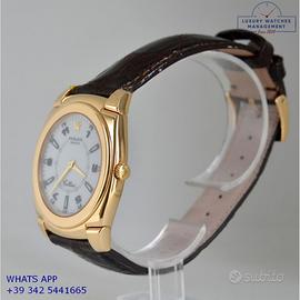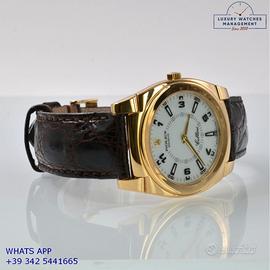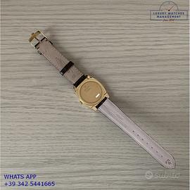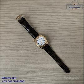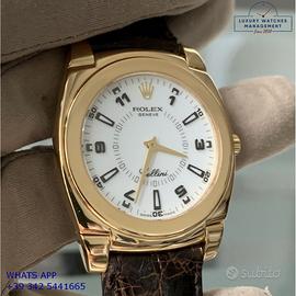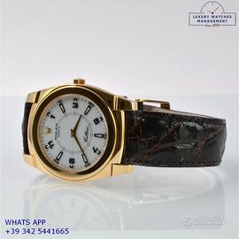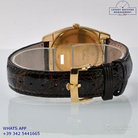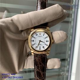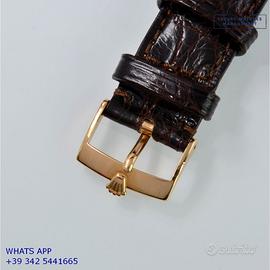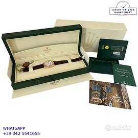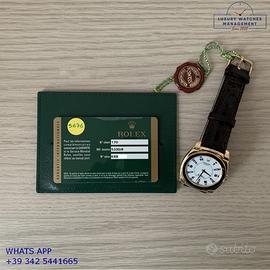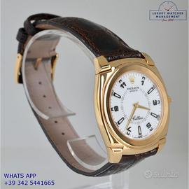 Rolex Cellini Cestello 5330/8 oro giallo 18KT, anno produzione 2002, ghiera in oro giallo 18KT liscia, vetro zaffiro piatto antiriflesso, quadrante in smalto colore bianco con indici arabi e sfere oro giallo 18KT, movimento meccanico a carica manuale, cinturino alligatore lucido colore marrone con fibbia oro giallo 18KT Rolex.