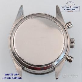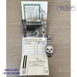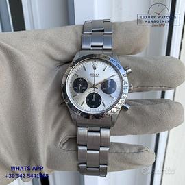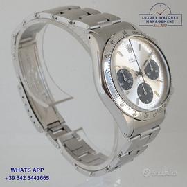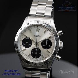 Rolex Cosmograph Daytona 6239 pulsanti a pompa acciaio, anno di produzione 1967, ghiera acciaio MK2 scala graduata 225, vetro plastica a cupola, quadrante colore argento con scritta grande Daytona a ore 06:00 indici e sfere al trizio originale Rolex dell’epoca, movimento meccanico manuale, bracciale Oyster acciaio maglie ripiegate a rivetti con deployante Rolex.