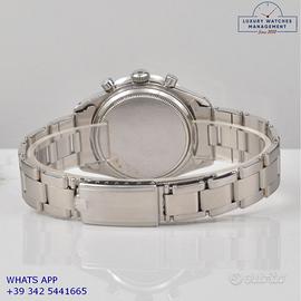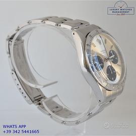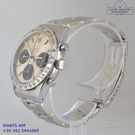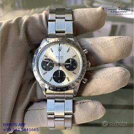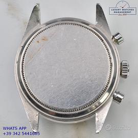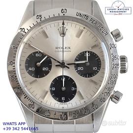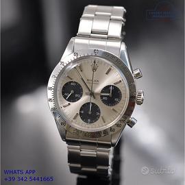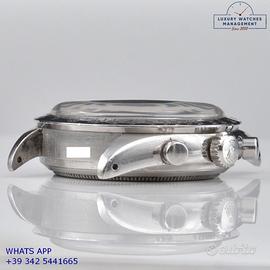 Rolex Cosmograph 6239 prima serie acciaio, anno di produzione 1964, ghiera acciaio scala graduata 225, vetro plastica a cupola, quadrante colore argento indici e sfere al trizio, movimento meccanico a carica manuale, bracciale Oyster acciaio a maglie ripiegate con rivetti con chiusura deployante originale Rolex dell’epoca.