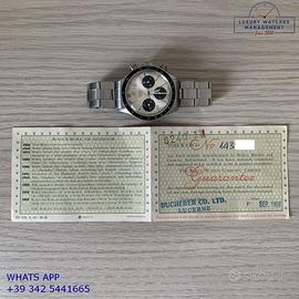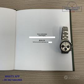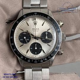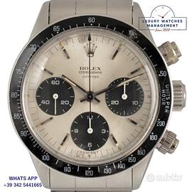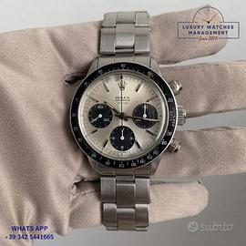Rolex Cosmograph Daytona 6240 acciaio prima serie con rari pulsanti "millerighe", anno di produzione 1966, ghiera acciaio MK1 con inserto bachelite scala graduata 200, vetro plastica bombato, quadrante colore argento con scritta piccola Daytona originale Rolex dell'epoca mai ritoccato o ristampato, movimento meccanico a carica manuale, bracciale elastico Oyster in acciaio con maglie ripiegate a rivetti chiusura deployante Rolex.