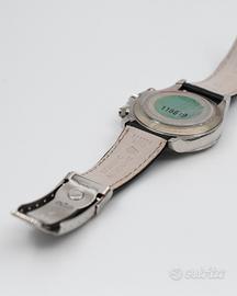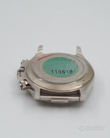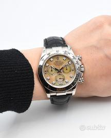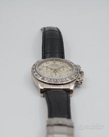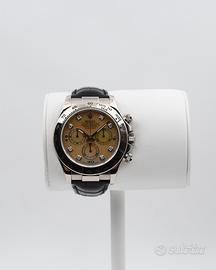 Proposto in condizioni eccellenti, questo esemplare del 2005 si distingue per il raffinato quadrante in madreperla giallo, impreziosito da indici con diamanti. Completo di corredo Verga Milano, foulard, scatola e garanzia. Revisionato presso il nostro laboratorio interno, cronografo automatico calibro 4130, condizioni eccellenti.
