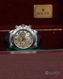 La cassa Oyster da 40 mm in oro bianco 18 kt presenta linee sportive ed eleganti, con lunetta incisa con scala tachimetrica. Il vetro zaffiro antigraffio protegge il quadrante, mentre il fondello a vite garantisce impermeabilità e robustezza.