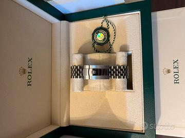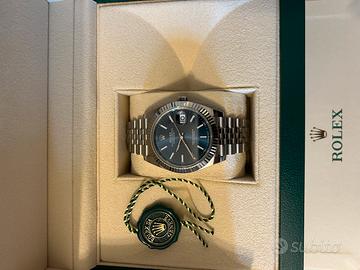 Rolex date just 41 mm blu con ghiera zigrinata e bracciale jubile in oro bianco. Anno 2023, in garanzia rolex. Orologio come nuovo, italiano , con tutto il suo corredo. Acquistato da me e indossato pochissime volte. Visionabile solo in gioielleria ( luogo sicuro sia per venditore che per compratore ) a Bergamo.