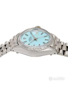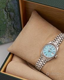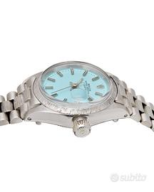 Rolex Date Lady president rare white gold corteccia 18kt ref 6927; Peso: 61.34; Misura: 14/17; Materiale: Oro bianco; Anno: 1972; Corredo: Scatola originale, Garanzia del rivenditore; Referenza: 6927; Carica: Automatico; Calibro: 2030; Rubini: 28; Colore quadrante: Tiffany; Corona: Acciaio; Diametro cassa: 26mm; Ghiera: Oro bianco Materiale cassa: Oro bianco; Materiale cinturino: Oro bianco; Vetro: Plastica Cod: 5119-a