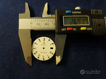 Quadrante Rolex originale per Date Oyster Perpetual, usato in ottime condizioni, adatto per ref.1500, bianco con indici acciaio e numeri romani. Il diametro è circa 27 mm come indicato nelle foto.