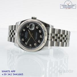 Rolex Datejust 116234 acciaio, anno di produzione 2008, ghiera oro bianco 18KT zigrinata, vetro zaffiro antiriflesso con lente cyclope, quadrante soleil colore argento con data indici e sfere al Super Luminova, movimento meccanico a carica automatica, bracciale Jubilee acciaio con chiusura deployante originale Rolex.