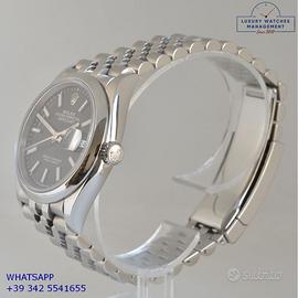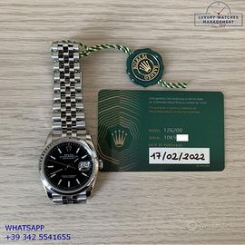 Rolex Datejust 126200 36MM con data acciaio, anno di produzione 2022, ghiera acciaio liscia, vetro zaffiro antiriflesso con lente ciclope, quadrante soleil colore nero con data, indici e sfere al Chromalight, movimento meccanico a carica automatica, bracciale Jubilee acciaio con chiusura deployante originale Rolex.