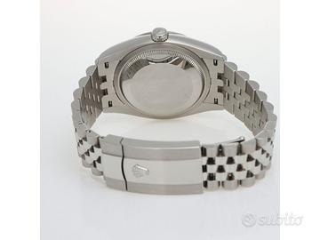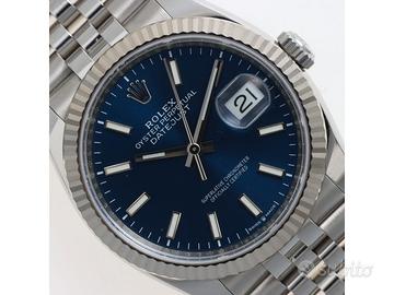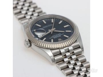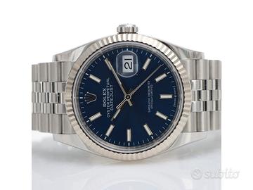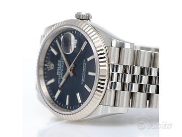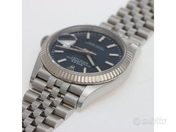 Clover Gioielli pone in vendita Rolex Datejust Ref. 126234 realizzato in acciaio, Quadrante Blu con indici a bastoni, Lunetta fissa zigrinata in oro bianco, Cassa di diametro 36mm, Corona di carica a vite, Datario ad ore 3. Bracciale modello jubilee. Orologio in condizioni eccellenti, anno 11/2021, Full Set.