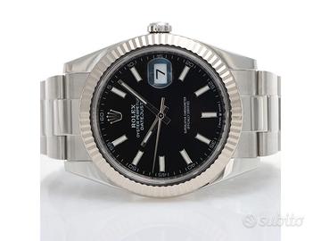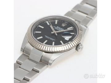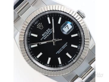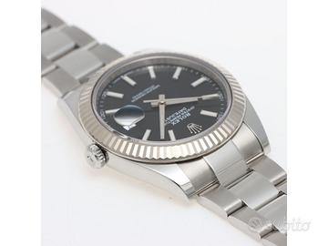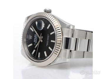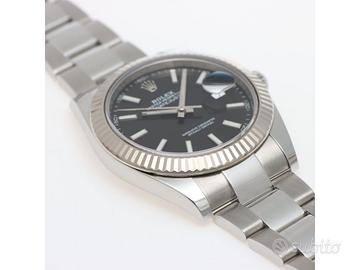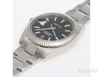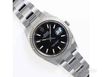 Clover Gioielli pone in vendita Rolex Datejust Ref. 126334 realizzato in acciaio, Quadrante nero, Lunetta fissa zigrinata in oro bianco, Cassa di diametro 41 mm, Corona di carica a vite, Datario ad ore 3. Bracciale modello Oyster. Orologio in condizioni ottime. Garanzia Italiana datata 04/2022. Full Set.