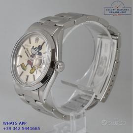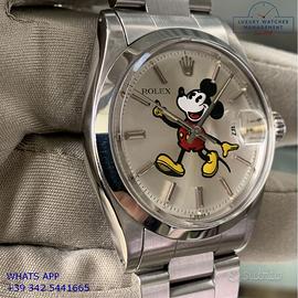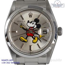 Rolex Datejust 1600 acciaio, anno di produzione 1974, ghiera acciaio liscia, vetro plastica bombato con lente ciclope, quadrante colore argento soleil con stampa Mickey Mouse (after-market ristampato su base originale Rolex), movimento meccanico a carica automatica, bracciale Oyster acciaio a maglie piene con chiusura deployante originale Rolex.