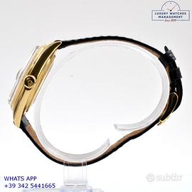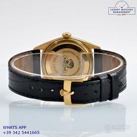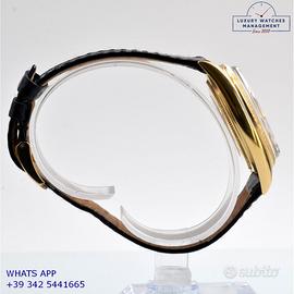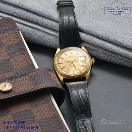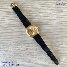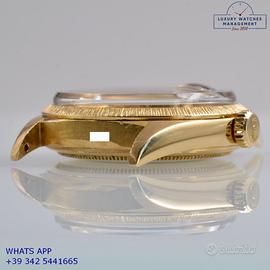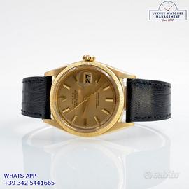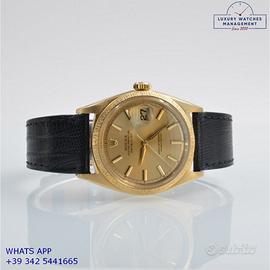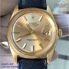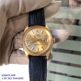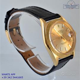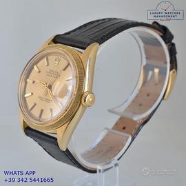 Rolex Datejust 1607 prima serie oro giallo 18KT, anno produzione 1964, ghiera con finitura lavorazione corteccia in oro giallo 18KT, vetro plastica con lente ciclope, quadrante colore champagne sfere a foglia originale Rolex dell’epoca mai ritoccato o ristampato, movimento meccanico a carica automatica, cinturino vintage di lucertola colore nero con fibbia oro giallo 18KT originale Rolex.